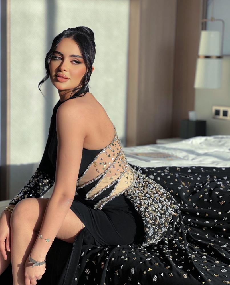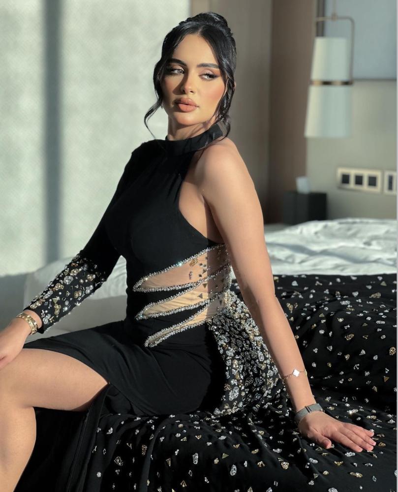 الفستان يتميز بتصميمه الأنيق والعصري ويأتي بلون أسود جذاب. التصميم يدمج بين الأناقة والبريق من خلال استخدام التطريزات البراقة باللون الفضي والذهبي الموزعة على الذراع اليمنى وعلى الجزء السفلي والجانبي من الفستان.