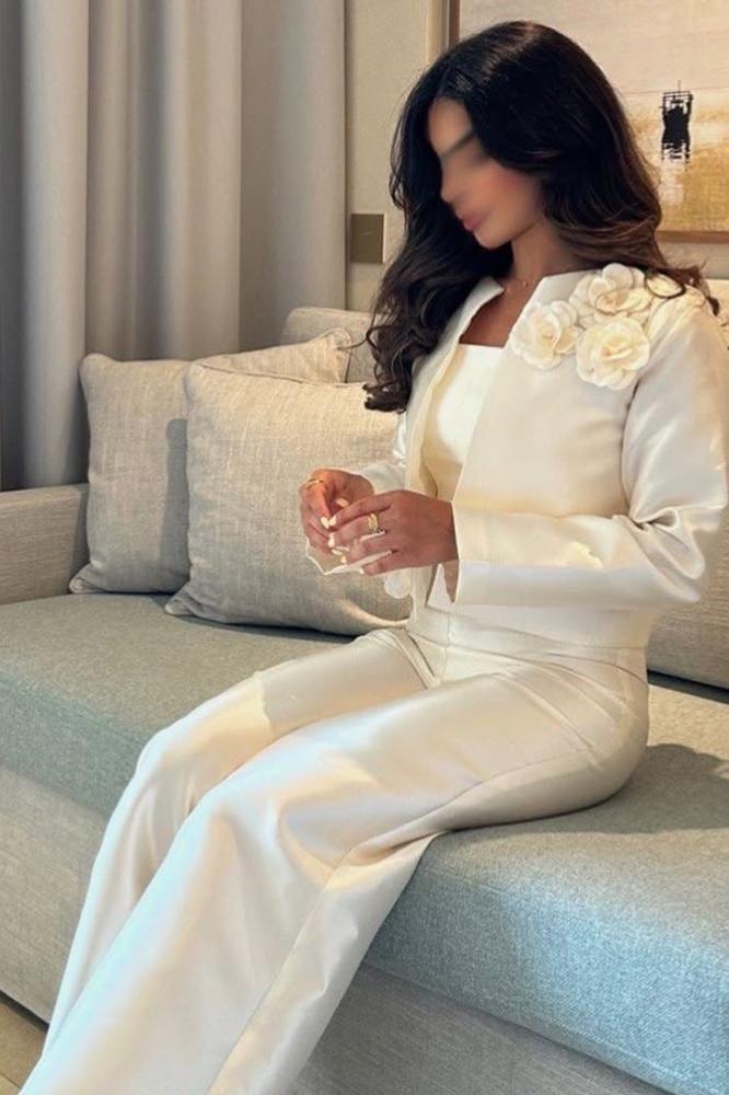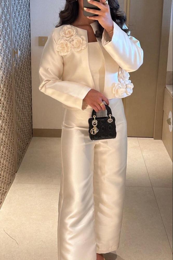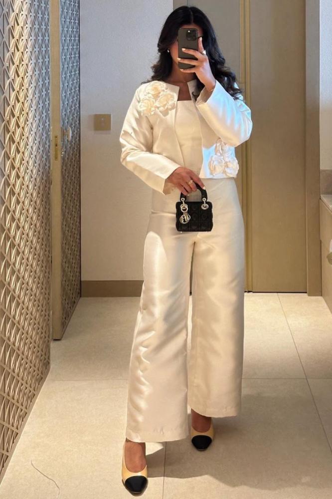 جمبسوت  عبارة عن طقم أنيق يتكون من قطعتين، مصنوع من قماش حريري باللون الأبيض. الجزء العلوي عبارة عن جاكيت قصير بأكمام طويلة ومزين بورود ثلاثية الأبعاد بنفس اللون على الصدر والجوانب، مما يضفي لمسة أنثوية وراقية. البنطال واسع الأرجل ويتناغم مع الجاكيت لإطلالة متكاملة. الطقم مدمج مع حقيبة يد سوداء صغيرة وحذاء كريمي بكعب مغطى بالأسود، ما يضيف توازنًا عصريًا إلى الإطلالة.