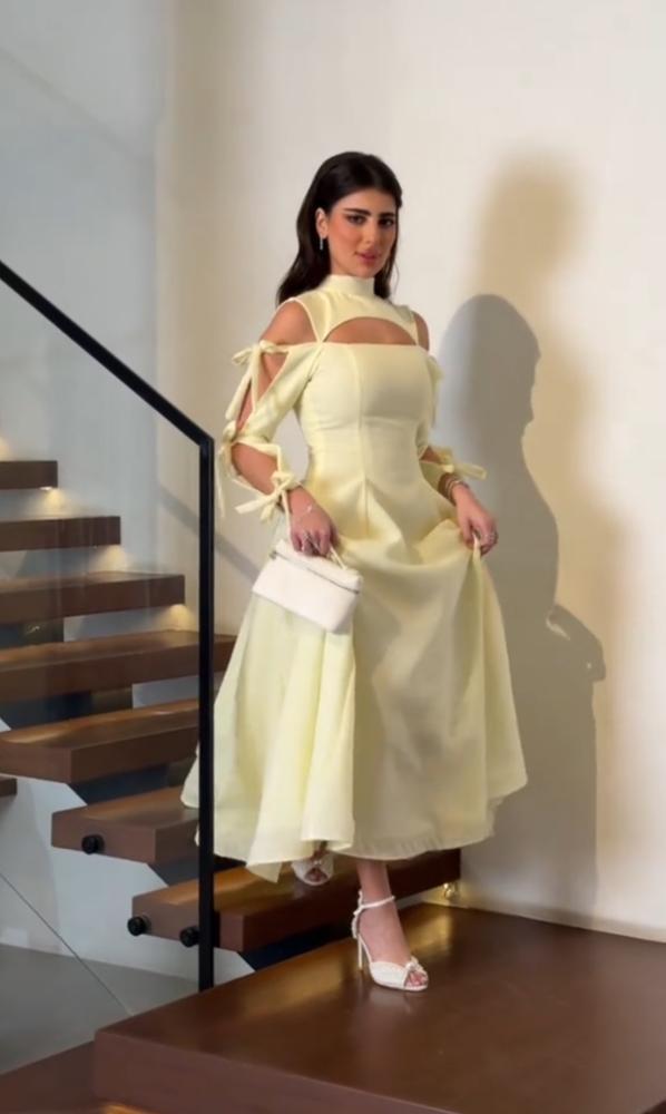 الفستان يتميز بتصميم أنثوي وأنيق باللون الأصفر الباستيل، بقصة متوسطة الطول مع تصميم كلاسيكي وعصري في نفس الوقت. يتميز الفستان بالآتي: