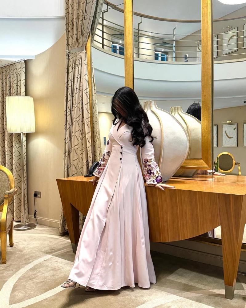 الفستان يتميز بتصميم أنيق وفاخر، حيث يأتي بقصة طويلة وواسعة تمنحه طابعًا ملكيًا راقيًا. القماش ناعمًا وانسيابيًا، مما يشير إلى استخدام خامات فاخرة الكريب الناعم، التي تضفي لمسة من الفخامة والأنوثة.