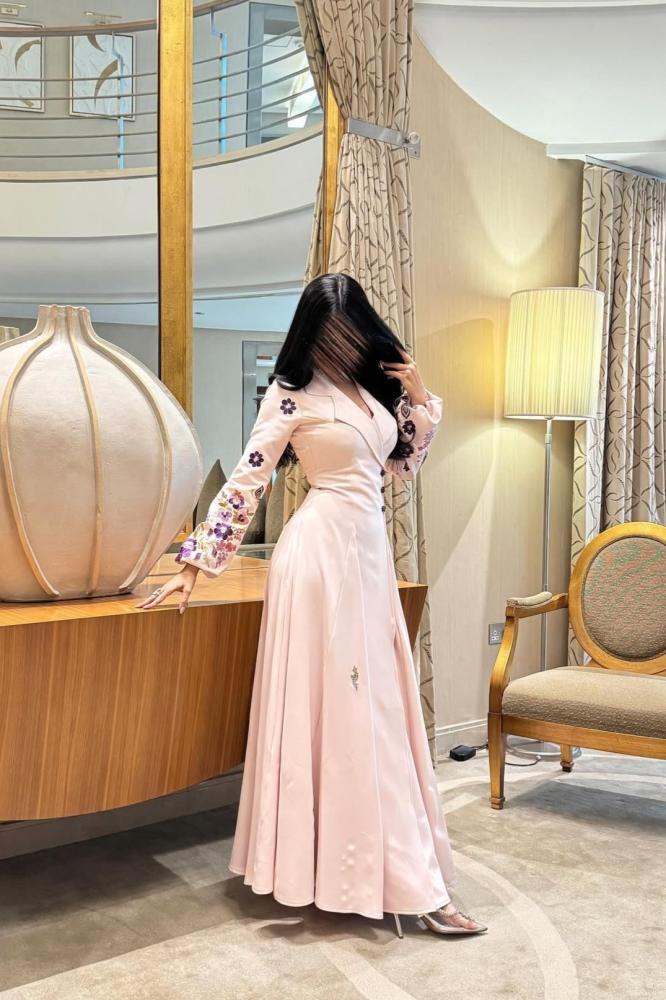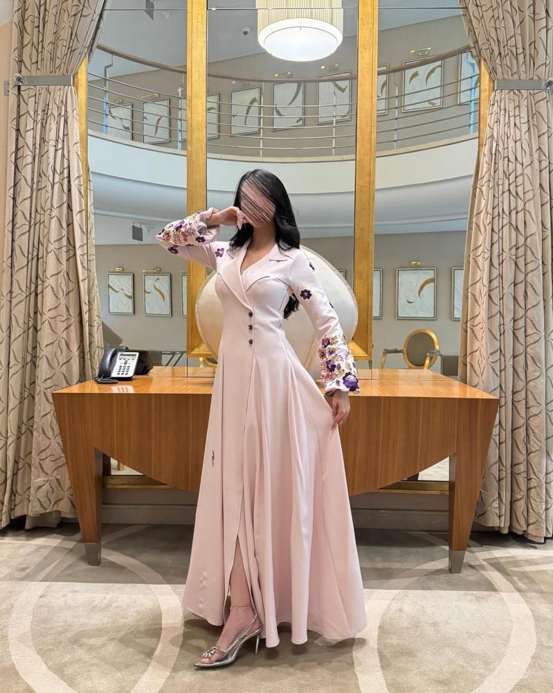 يتميز الفستان بياقة بتصميم جاكيت مع أزرار أمامية، مما يمنحه لمسة كلاسيكية أنيقة. أما الأكمام الطويلة، فهي مزينة بتطريزات زهرية رائعة بألوان بنفسجية وذهبية، تضيف لمسة فنية جذابة تعكس تفاصيل راقية ودقيقة في التصميم