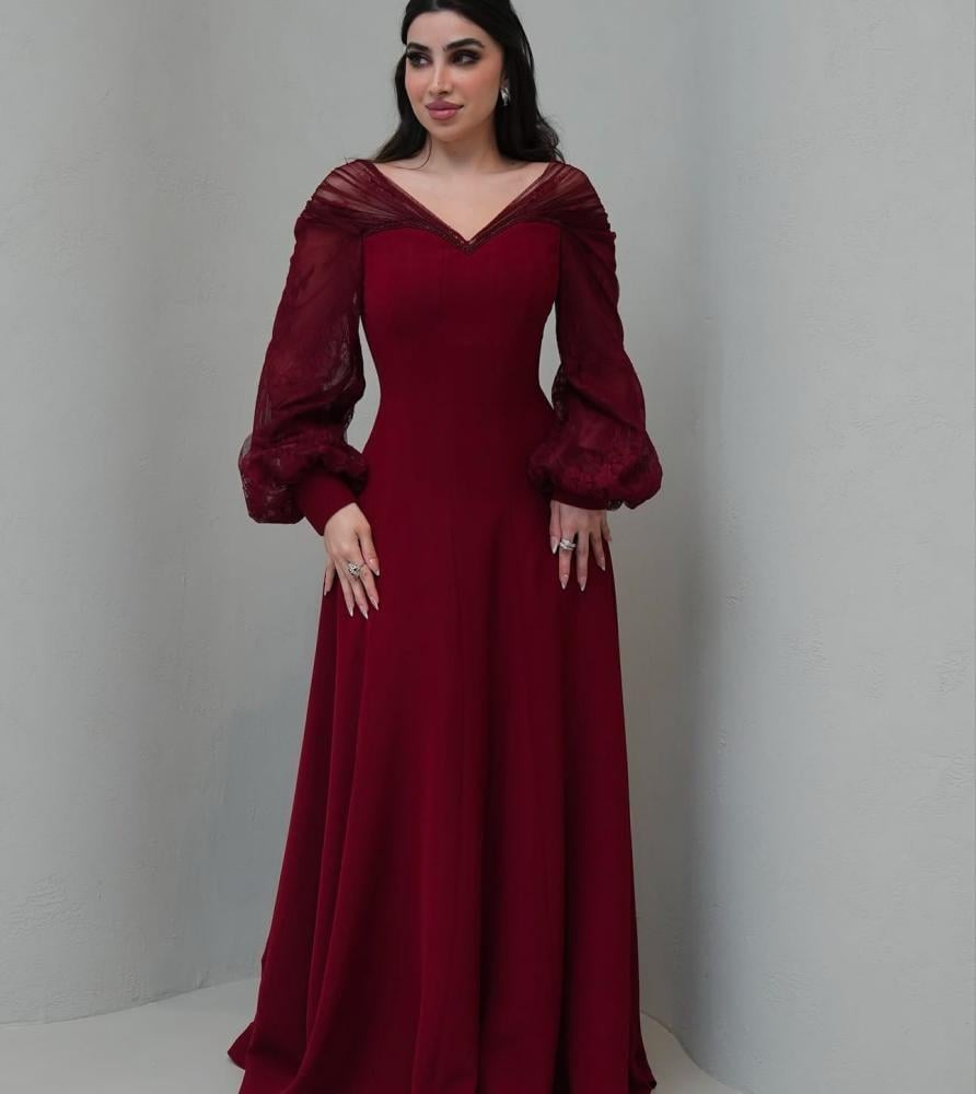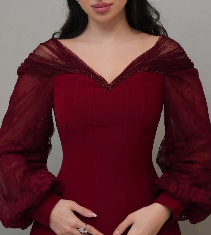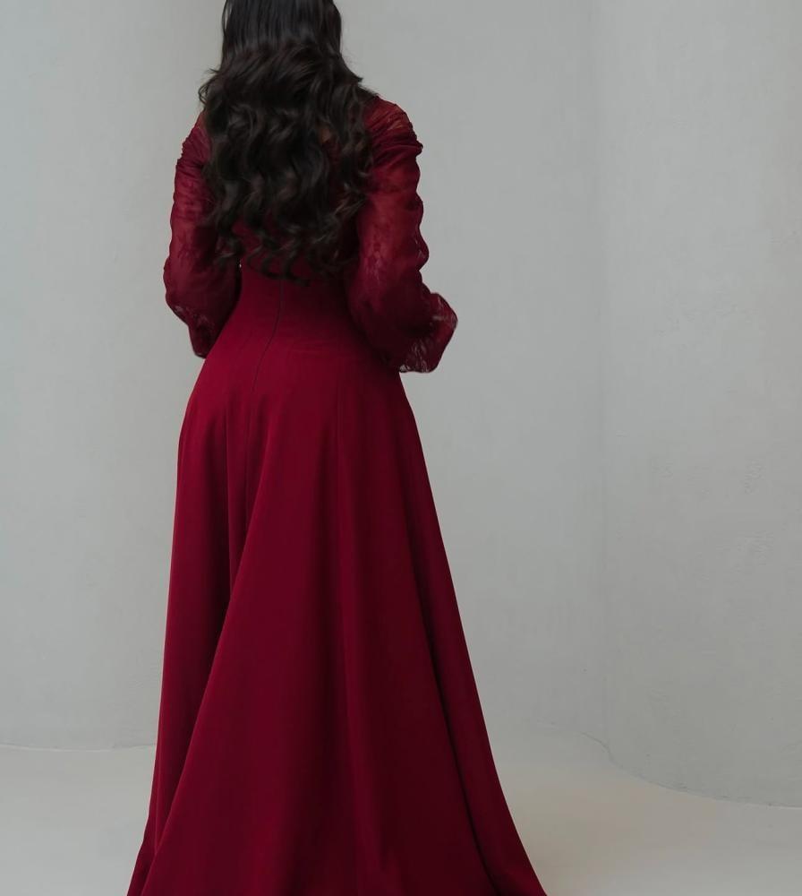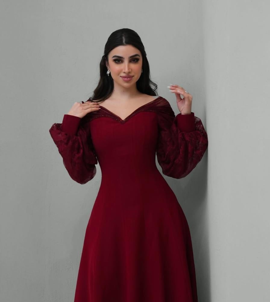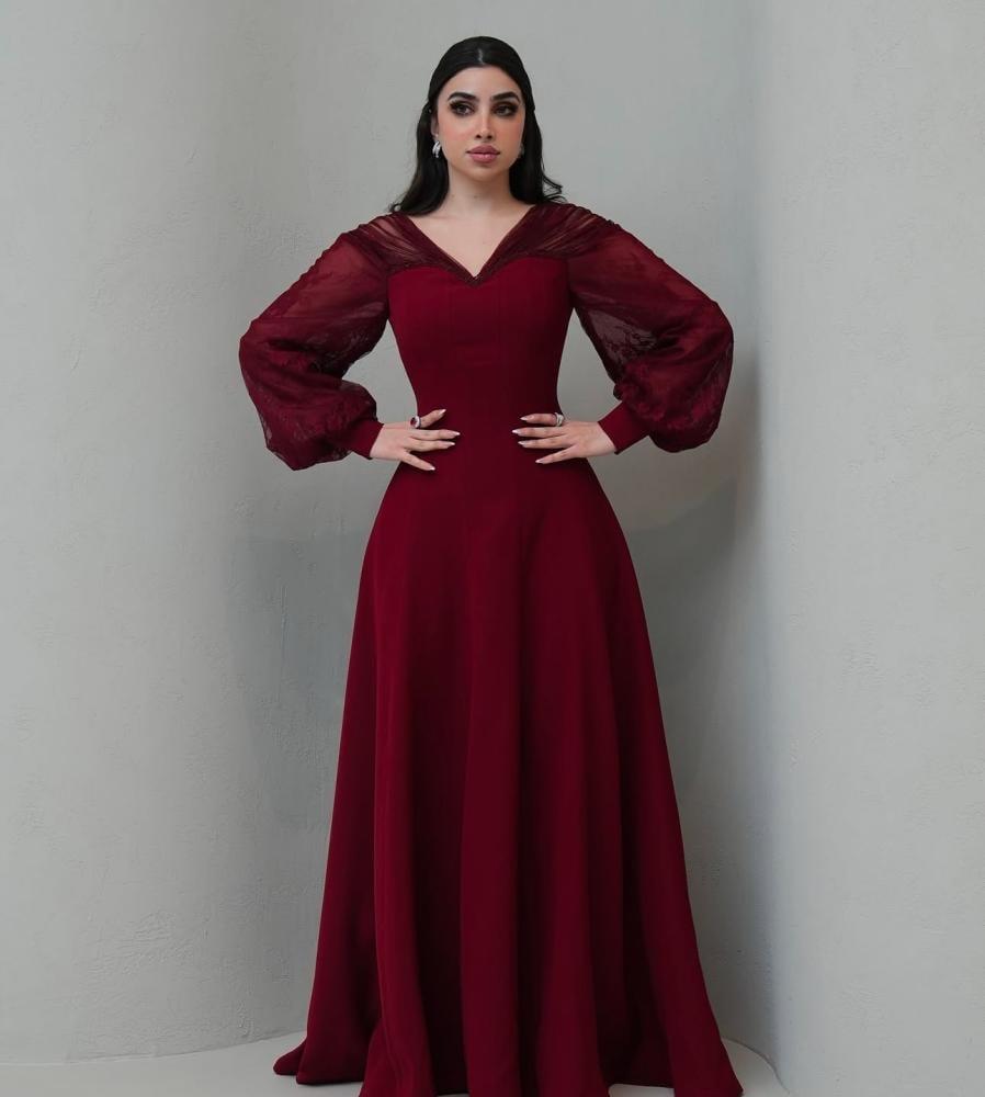 فستان فاخر بلون العودي  الداكن، بتصميم أنثوي يجمع بين الأناقة والفخامة.