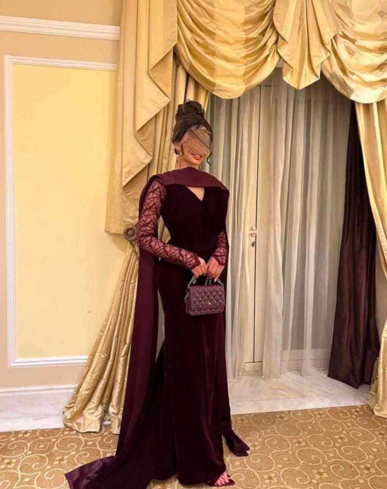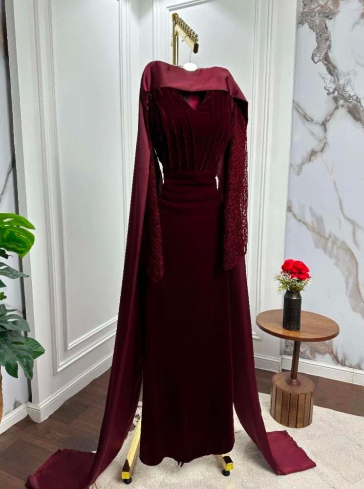الفستان يتميز بتصميم راقٍ وأنيق للغاية، وهو من المخمل باللون العنابي العميق، مما يضفي عليه طابعًا فخمًا وجذابًا. يتميز الفستان بأكمام من الدانتيل الشفاف، التي تضفي لمسة من الأنوثة والرقي. كما يحتوي التصميم على وشاح يمتد من الكتف ويعطي مظهرًا ملكيًا يعزز من جاذبية الفستان.