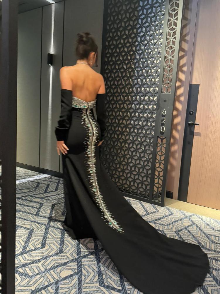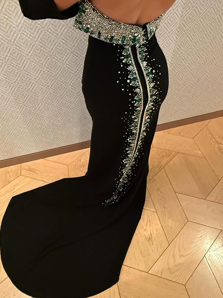 أنيق فستان سهرة ملكي باللون الأسود الساحر، بتصميم كتف مكشوف يعكس أنوثة راقية وفخامة لا مثيل لها. يزدان الفستان بخط تطريز فاخر مرصع بالكريستال اللامع على الظهر ليمنحك إطلالة تخطف الأنظار في كل مناسبة. القصة الضيقة مع ذيل انسيابي أنيق تضفي جاذبية إضافية على القوام.