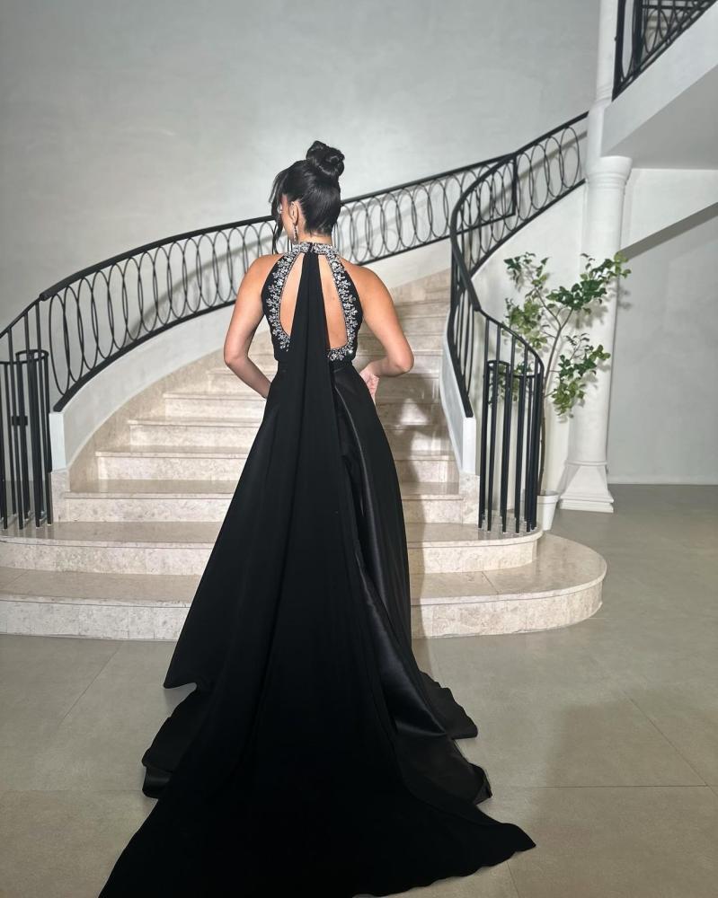 الفستان يتميز بتصميم أنيق وفخم للغاية. يتميز بلونه الأسود الكلاسيكي الذي يعبر عن الرقي والذوق الرفيع. الجزء العلوي مصمم بقصة عالية حول الرقبة مزينة بتطريزات أو أحجار براقة، مما يضيف لمسة من التألق. الظهر مفتوح بتفاصيل فريدة تضفي جاذبية إضافية.