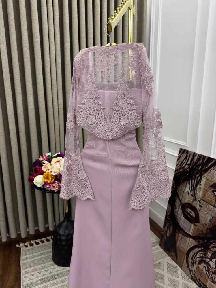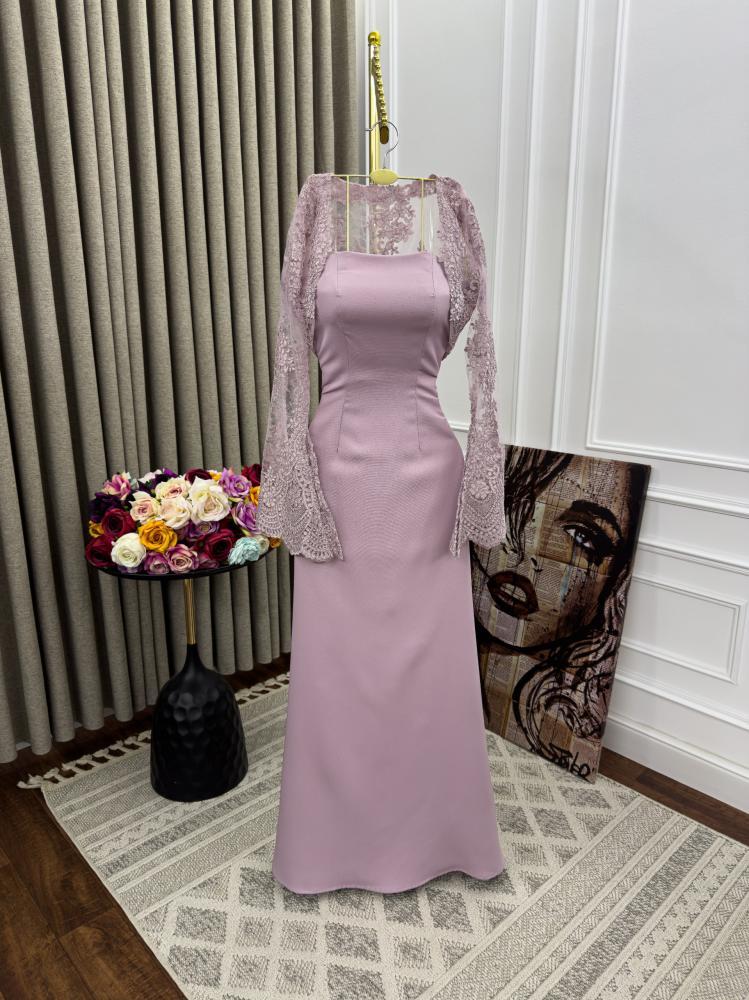 أنيق بلون وردي فاتح (موف مائل للوردي) بتصميم كلاسيكي راقٍ. يتميز الفستان بقصة ضيقة من الأعلى مع خصر محدد وتنورة طويلة مستقيمة.