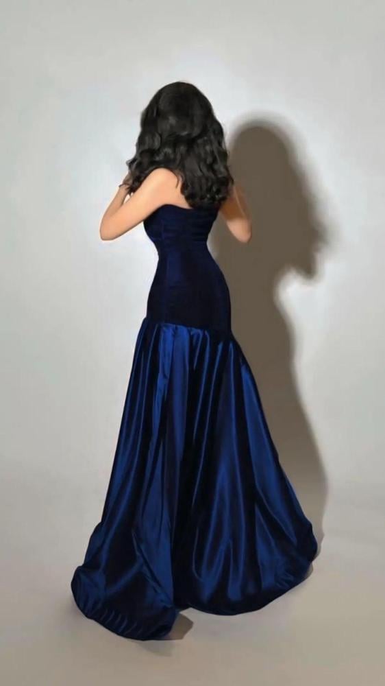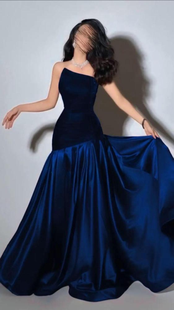 •لون الفستان: الأزرق الداكن (الكحلي)، الذي يرمز إلى الفخامة ويمنح إطلالة راقية ومثالية للسهرات الرسمية.