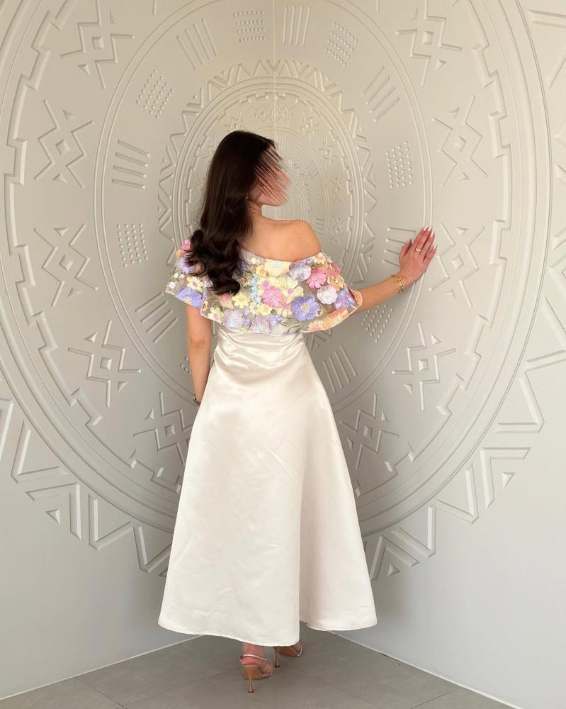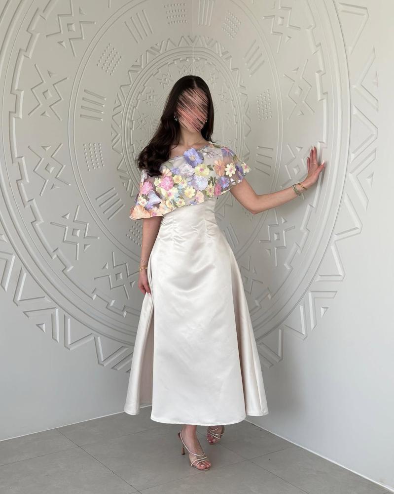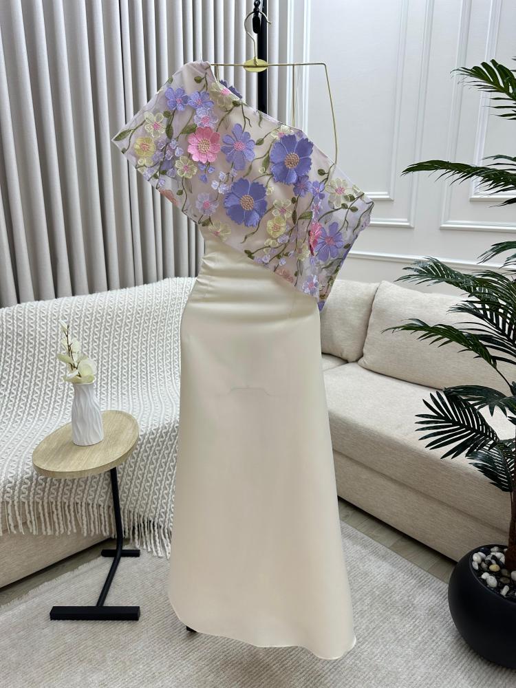 فستان فاخر مصمم من قماش الساتان الحريري الناعم، الذي يتميز بلمعته الرقيقة وانسيابيته الفاخرة، ليمنحك إطلالة راقية وأنيقة. يأتي بتصميم أوف شولدر يعكس الأنوثة بأسلوب عصري، مع طبقة شفافة مطرزة بتفاصيل ورود ثلاثية الأبعاد بألوان ناعمة، تضيف لمسة من الرقي والجمال الطبيعي.
